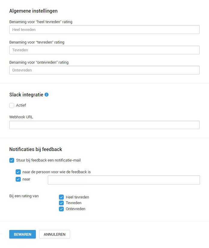 De eerste stap in het onderzoeken van de klanttevredenheid is het personaliseren van een feedbacksysteem. Via instellingen kan je zelf kiezen welke vraag je stelt aan je klanten. Je personaliseert heel eenvoudig het uitzicht van de form zodat deze volledig in de lijn ligt van jouw bedrijf.